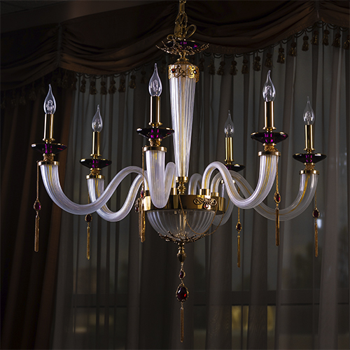 Подвесная люстра имеет 6 рожков и используется для общего освещения. Она крепятся к потолку с помощью шнура, струны или цепи. Арматура изготовлена из металла в золотом цвете, декоративные элементы из фиолетового (аметист) и прозрачного муранского стекла, подвески выполнены из фиолетового (аметист) хрусталя Swarovski.