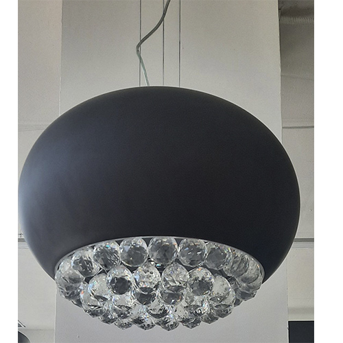 Люстра выполнена из стекла черного цвета и украшена прозрачными стразами, которые снизу обрамляют люстру и дают преломление свету от ламп. Основание, каркас и подвесы выполнены из хромированного металла. Провод питания – серебристого цвета.