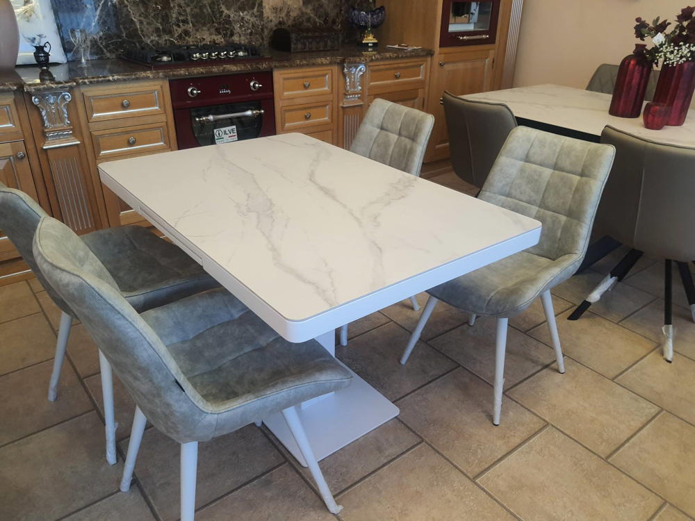 Столешница изготовлена из керамики, имитирующей благородный белый мрамор. Этот материал практичен: он устойчив к высоким температурам, влаге и царапинам.