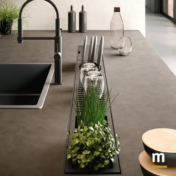 Полуостров с интегрированным оборудованным каналом в столешнице из HPL-ламината Peltro. Функциональное и эстетическое решение, предлагающее передовые возможности для персонализации рабочей поверхности.